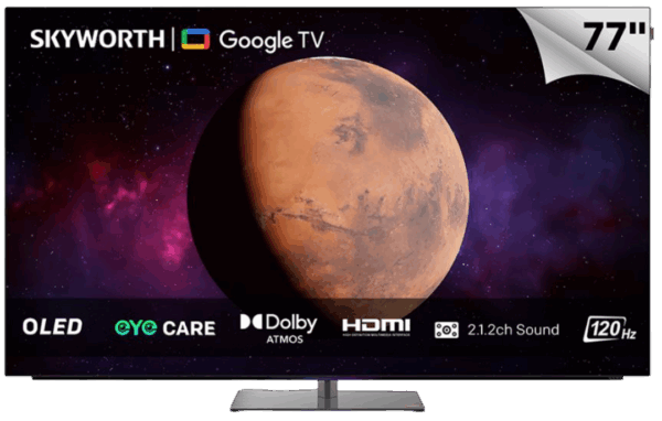 Skyworth 77-Inch SXF9850 OLED UHD Google TV – Resolution 3840 × 2160, OLED Display, Brightness Normal 185 nits / Peak 500 nits / HDR Peak 900 nits, Contrast Ratio 185000:1, Refresh Rate 120Hz, Response Time 0.1ms, HDR10/HDR10+/HLG & Dolby Vision IQ, Dolby Atmos 2.1.2 Channel Sound System (65W RMS), VRR (Variable Refresh Rate), Game Mode, MEMC, Google TV OS, Google Play Store, Chromecast Built-in, Google Assistant with Far-Field Voice Control, HDMI 2.1 Ports x2 (HDMI 2 & 3), HDMI 2.0 Ports x2 (HDMI 1 & 4), USB 2.0 Ports x2, RF Input, Composite Input (3.5mm), SPDIF Optical Output, Ethernet LAN, Wi-Fi 2.4G+5G (2T2R), Bluetooth 5.1, Swiveling Base, Colorful Light Strip, Light & Motion Sensors, Wall Mountable 400 x 400 mm, Remote Control (IR + Bluetooth), Power Consumption 500W, Standby <0.5W, Retail Box, 3 Year Limited Warranty.