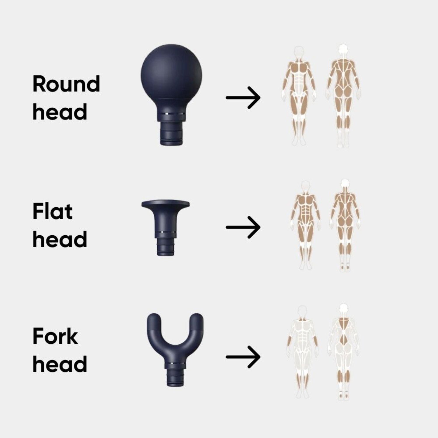 - Target different muscle groups effectively with three interchangeable massage heads.